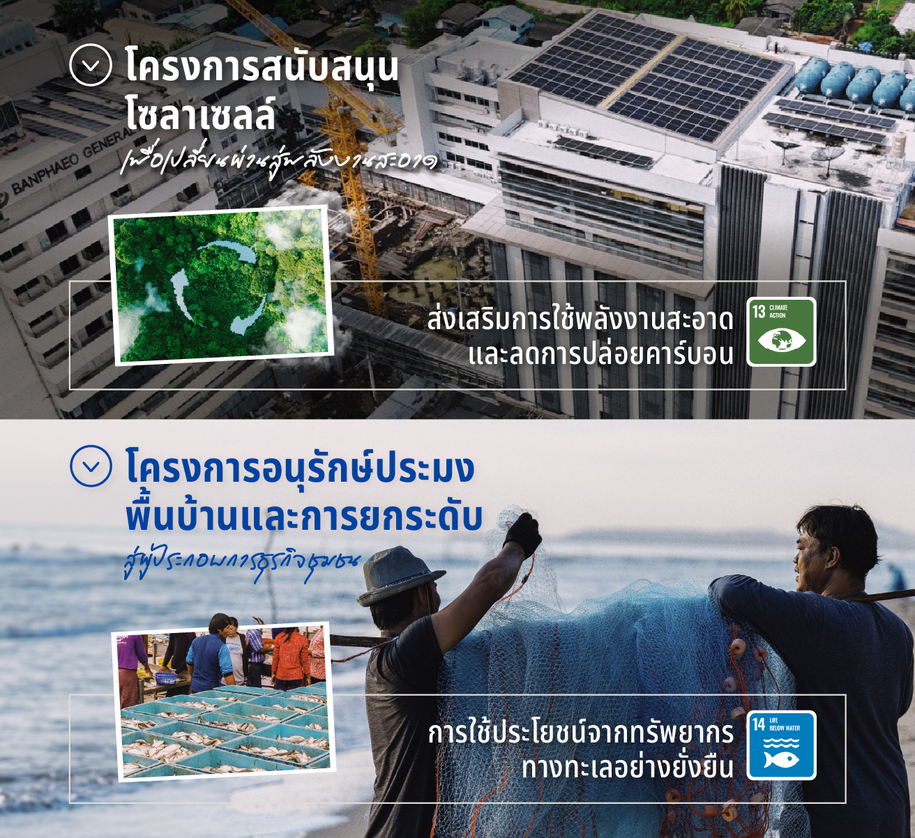 เป้าหมายสุดท้าย คือ SDGs ข้อ 14 ‘ นิเวศทางทะเลและมหาสมุทร ’ (Life Below Water) เราสนับสนุนชาวประมงให้หันมาทำการประมงแบบยั่งยืน ที่ไม่ได้แค่ช่วยยกระดับวิถีชีวิตของเขาให้เป็นผู้ประกอบการที่มีรายได้มั่นคงเท่านั้น แต่ยังช่วยให้ทรัพยากรในท้องทะเลไม่สูญหาย และเพืื่อให้ระบบนิเวศของทะเลยังสมบูรณ์อยู่ ให้เราได้พึ่งพาประโยชน์ต่อไป