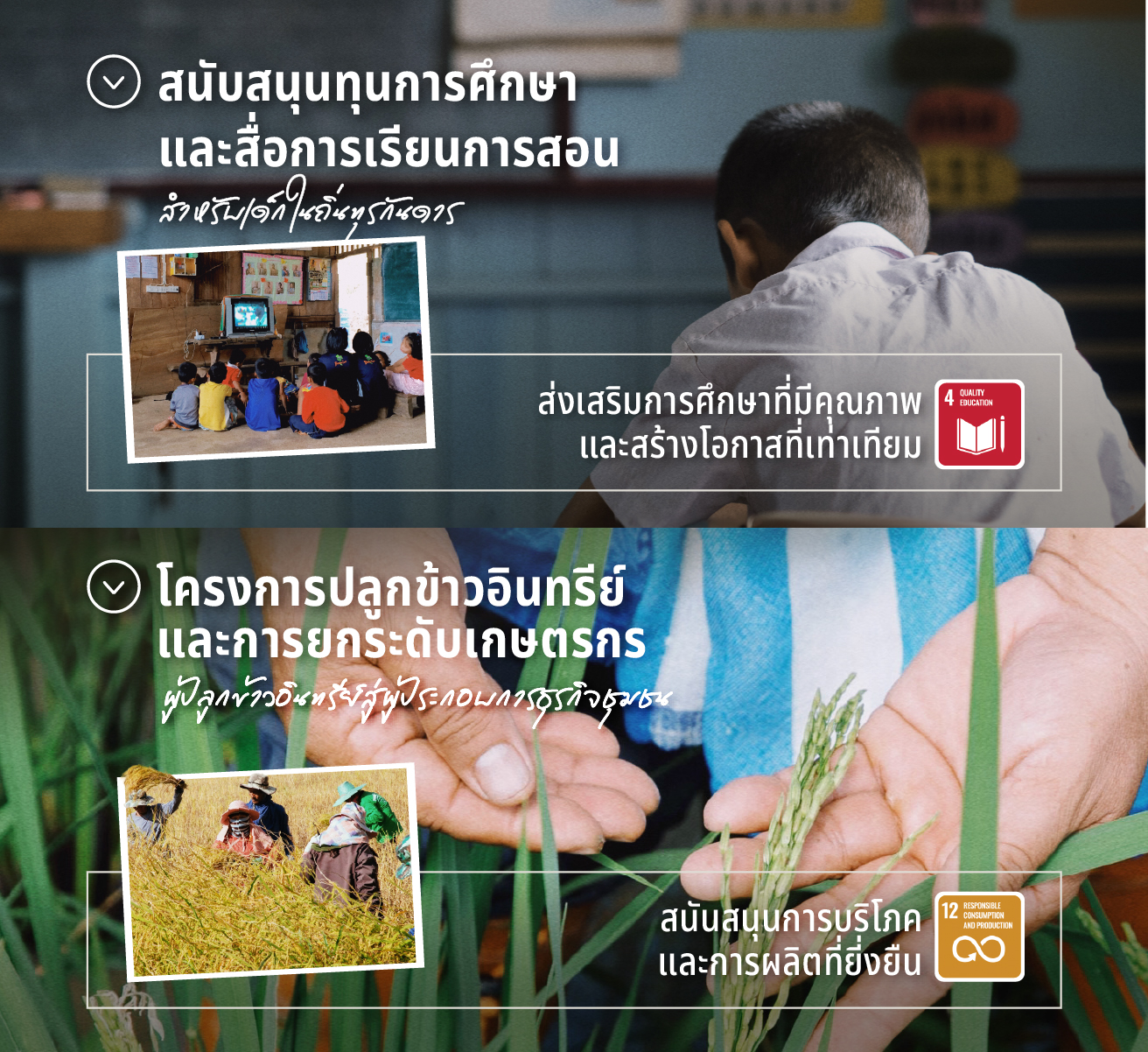 อีกหนึ่งรากฐานสำคัญคือ SDG ข้อ 4 ‘ การศึกษาที่มีคุณภาพ ’ (Quality Education) เพราะเด็ก ๆ คือรากฐานของประเทศ เราเชื่อว่าทุกครั้งที่เรายกระดับโรงเรียนในพื้นที่ห่างไกล ปรับปรุงสภาพแวดล้อมการเรียนรู้ หรือพัฒนาเครื่องมือที่ช่วยเปิดโลกให้เด็ก ๆ ได้เรียนรู้ นั่นไม่ใช่เพียงการพัฒนาโรงเรียนหนึ่งแห่งเท่านั้น แต่คือการสร้างอนาคตให้กับครอบครัวหนึ่ง ชุมชนหนึ่ง และประเทศทั้งประเทศไปพร้อมกัน เพราะสำหรับเรา “ เด็กทุกคน ” คือเมล็ดพันธุ์แห่งอนาคต และเมื่อทุกคนเข้าถึงการศึกษาที่มีคุณภาพได้อย่างเท่าเทียม นั่นหมายถึงโอกาสที่มากขึ้น และคุณภาพชีวิตที่ดีขึ้นอย่างแท้จริง