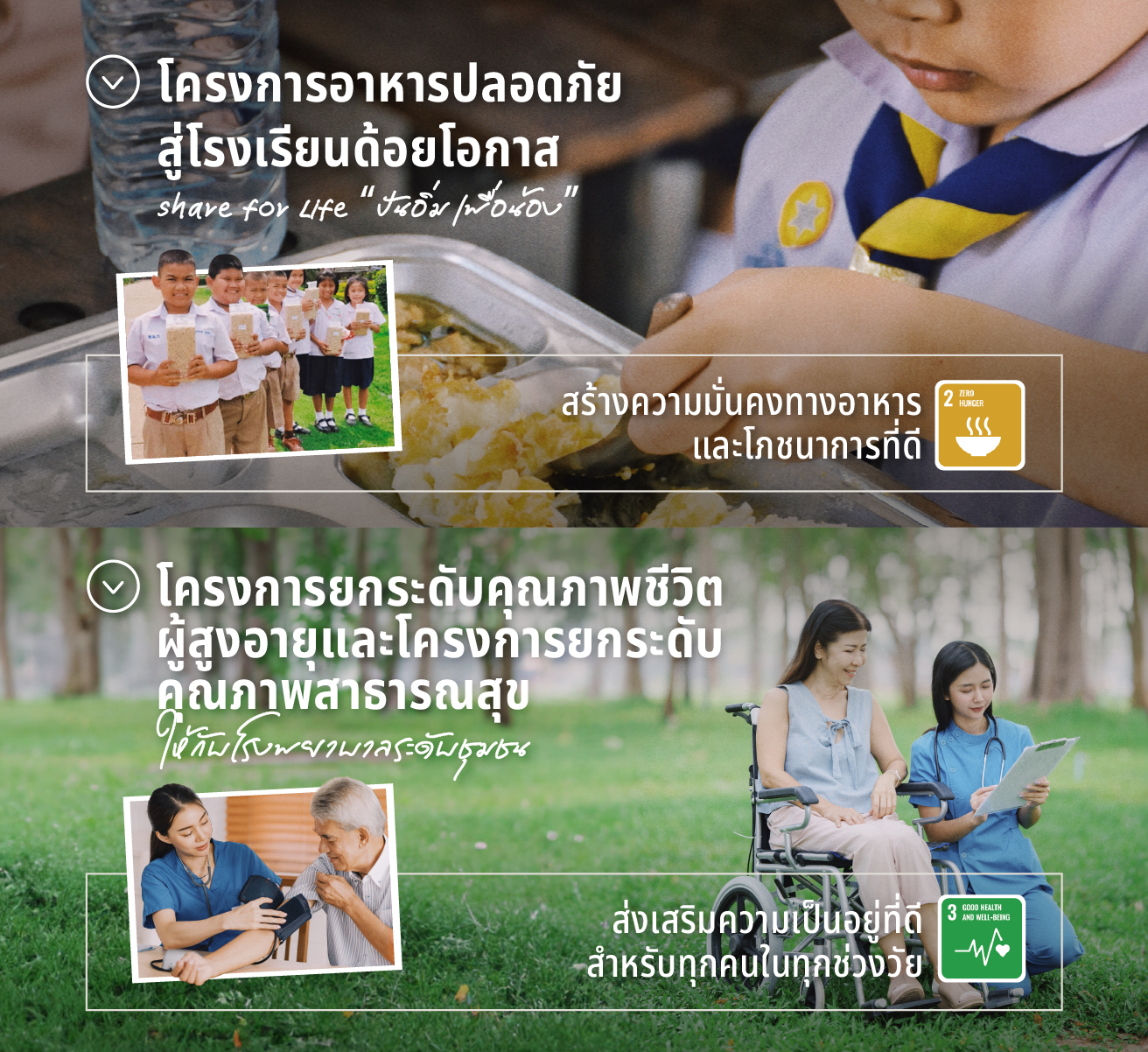 ต่อมาเป้าหมาย SDGs ข้อ 3 คือ ‘ การมีสุขภาพและความเป็นอยู่ที่ดี ’ (Good Health and Well-being) เราเชื่อว่าคุณภาพชีวิตที่ดีเริ่มต้นที่ “ การเข้าถึงการรักษา ” ไม่ว่าจะเป็นโครงการผ่าตัดเคลื่อนที่ การสนับสนุนศูนย์การแพทย์ ไปจนถึงการพัฒนาระบบดูแลผู้สูงอายุในชุมชน ทุกโครงการล้วนถูกออกแบบมาเพื่อให้ผู้คนเข้าถึงการดูแลด้านร่างกาย อารมณ์ และจิตใจอย่างเท่าเทียม เพราะสำหรับเรา “ สุขภาพดี ” ไม่ควรเป็นเรื่องของโอกาส แต่คือ สิทธิ์ขั้นพื้นฐานของมนุษย์ทุกคน ดังนั้นเป้าหมายข้อนี้จึงมุ่งเน้นให้ทุกคนได้รับการดูแลอย่างทั่วถึง รอบด้าน และยั่งยืนอย่างแท้จริง